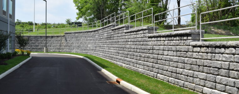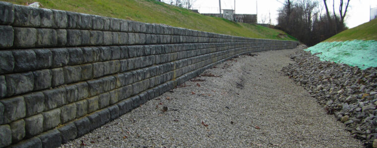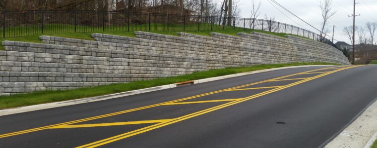 In 2008, JC Hines and Associates designed this segmental retaining wall to support the primary access drive to a new elementary school in the Cincinnati suburb of Mt. Healthy. The wall is designed with dry-cast modular concrete block facing units and PVC coated polyester (PET) geogrid that secures the facing system to a coherent reinforced earth mass created by multiple layers of the geogrid reinforcement. The maximum height of this structure is 19 feet.
