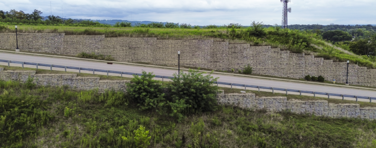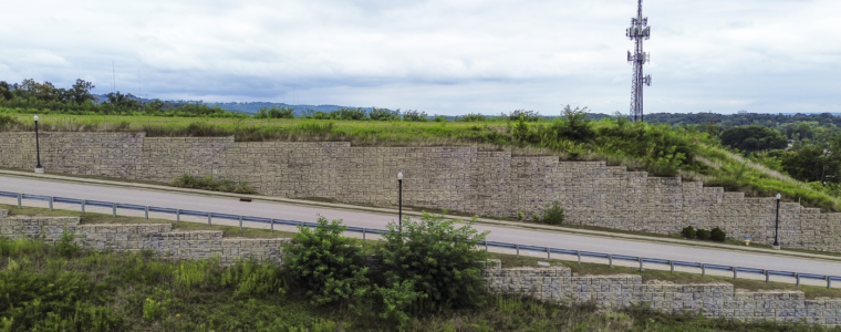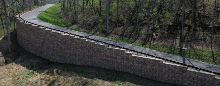 The ultimate goal of the 21st Century Parks organization is to construct a contiguous beltway of interconnected parks and outdoor recreational areas around the city of Louisville, Kentucky. In project phase 3A, designers were faced with the challenge of transitioning the new Park Road with the existing Echo Trail near Floyds Fork Creek. This ultimately required a 41-foot embankment to be constructed over soft soils. JC Hines and Associates prepared the mechanically stabilized earth retaining wall design utilizing back-to-back precast modular block walls reinforced with 12-inch strips of geogrid soil reinforcement. Construction was completed in the Spring of 2013.