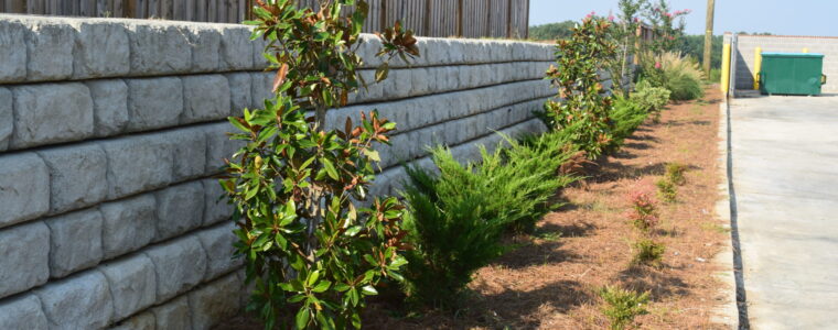 The developer for this residential subdivision property needed a retaining wall to support a cut excavation at the rear of the project site. The proposed wall would be 9 feet tall and be located only 5 feet from the property line. MMC Materials, Inc., manufacturers of the Redi-Rock retaining wall system in Jackson, Mississippi, called on JC Hines and Associates to see if Redi-Rock would work for this site.