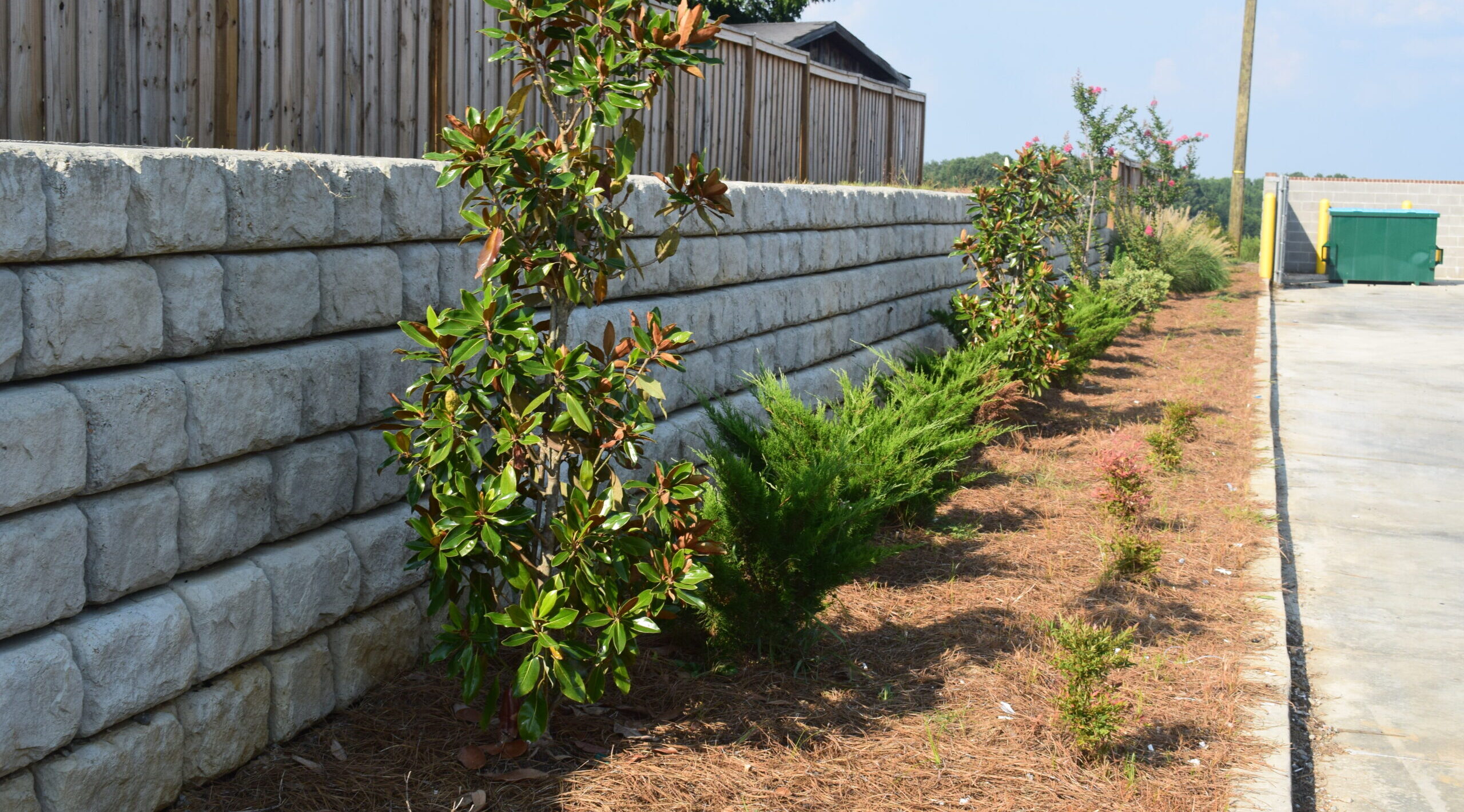 The total face area of the wall is 974 square-feet, and the natural gray cobblestone Redi-Rock units were manufactured by MMC Materials in Jackson, MS.