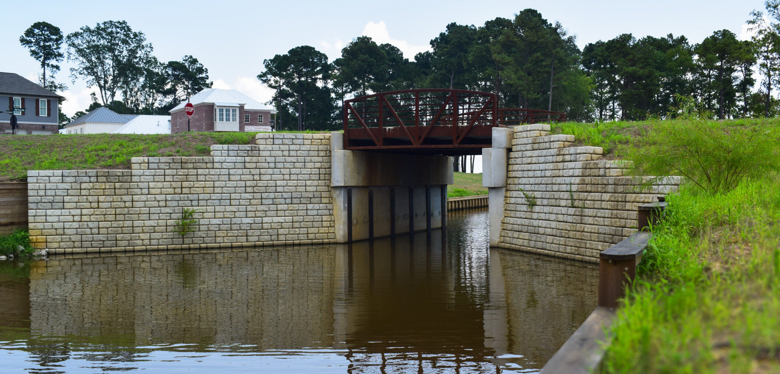 To connect the new development with the existing neighborhood, a bridge was designed to cross over the canal. Supporting the bridge would be abutment walls with wing wall sections to support the embankments leading up to the bridge. The general contractor at Lost Rabbit contacted MMC Materials, local Redi-Rock supplier in Jackson, to determine if the Redi-Rock system could provide a cost-effective solution for the wing wall sections.